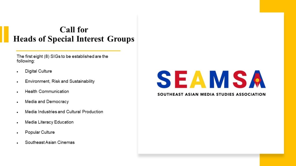 SEAMSA seeks to launch Special Interest Groups (SIGs) that cover relevant research areas in Southeast Asian Media Studies. The first eight (8) SIGs to be established are the following: