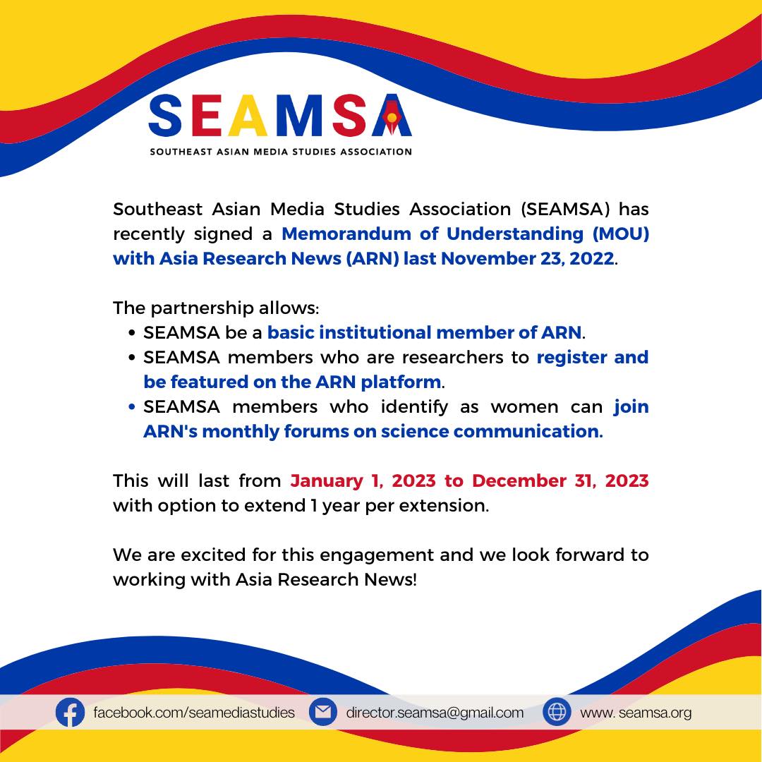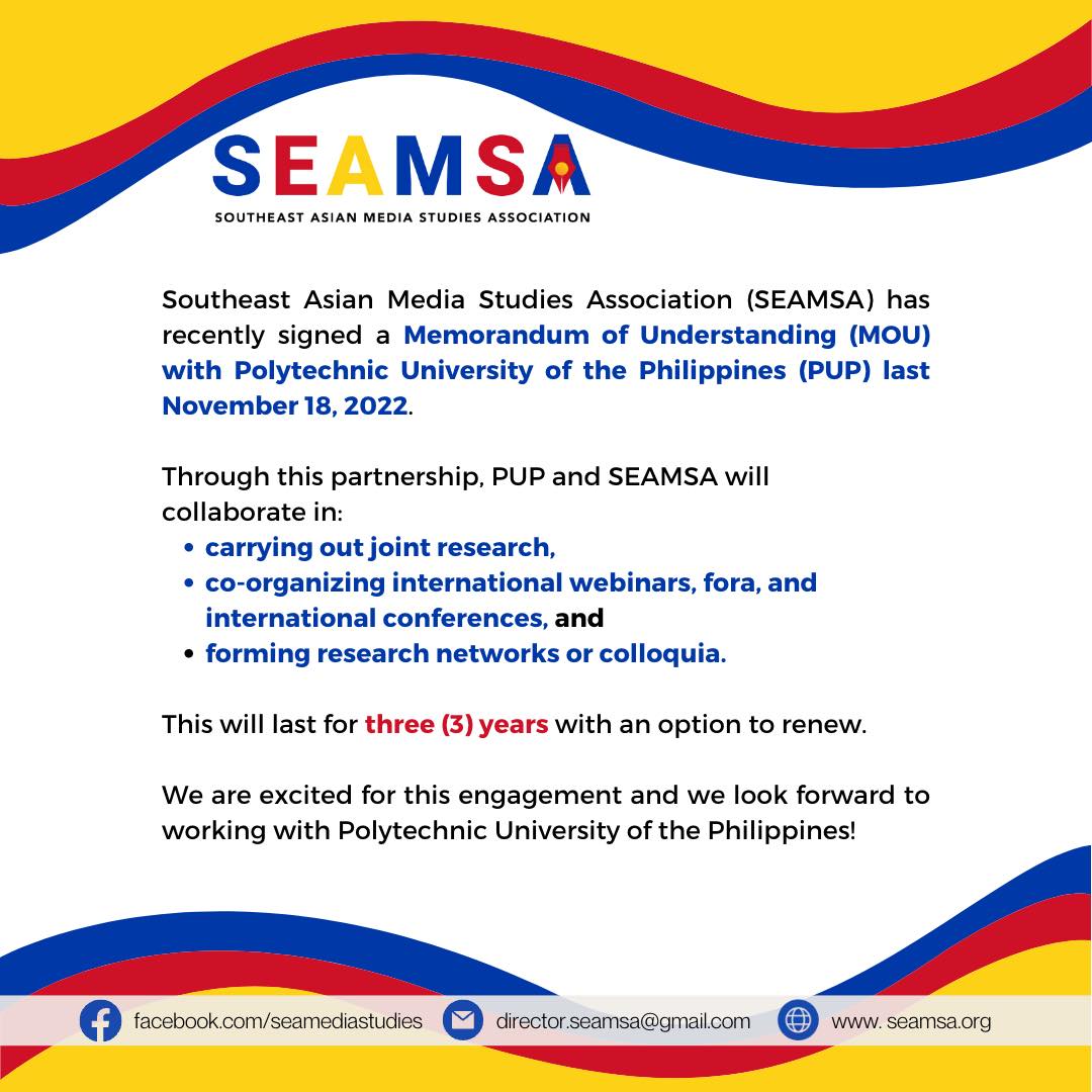 Southeast Asian Media Studies Association (SEAMSA) has recently signed Memorandum of Understanding with Asian Journals Network (AJN), Asia Research News (ARN), and Polytechnic University of the Philippines (PUP). We look forward to the fruitful cooperation between SEAMSA and the partners and have been working to create more partnerships in the future.