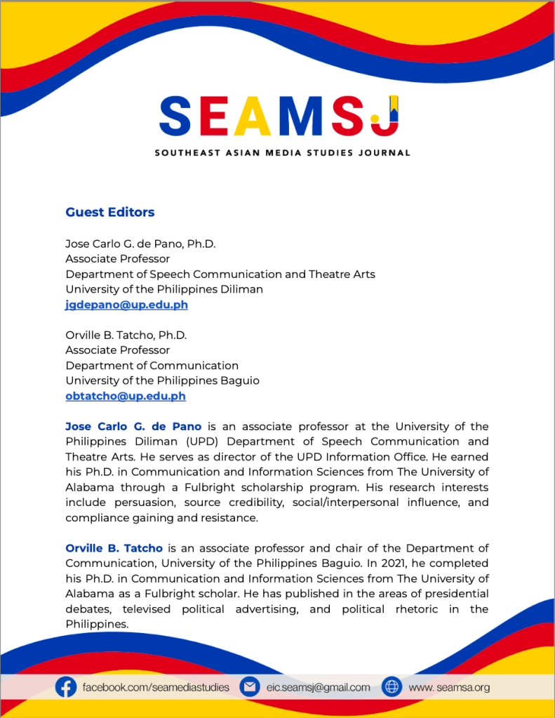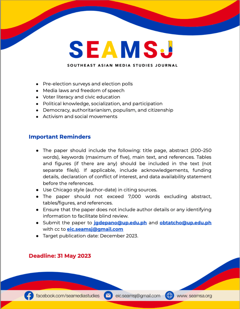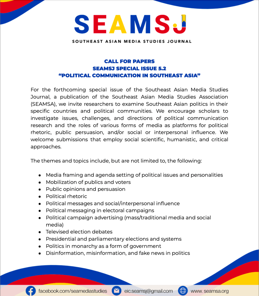 Call for Papers SEAMSJ Special Issue 5.2 “Political Communication in Southeast Asia” Posted byseamsa1 Mar 20232 Mar 2023Posted inAnnouncements For information about the journal, please visit: https://seamsa.org/seamsjournal/ Share this: Click to email a link to a friend (Opens in new window) Email Related