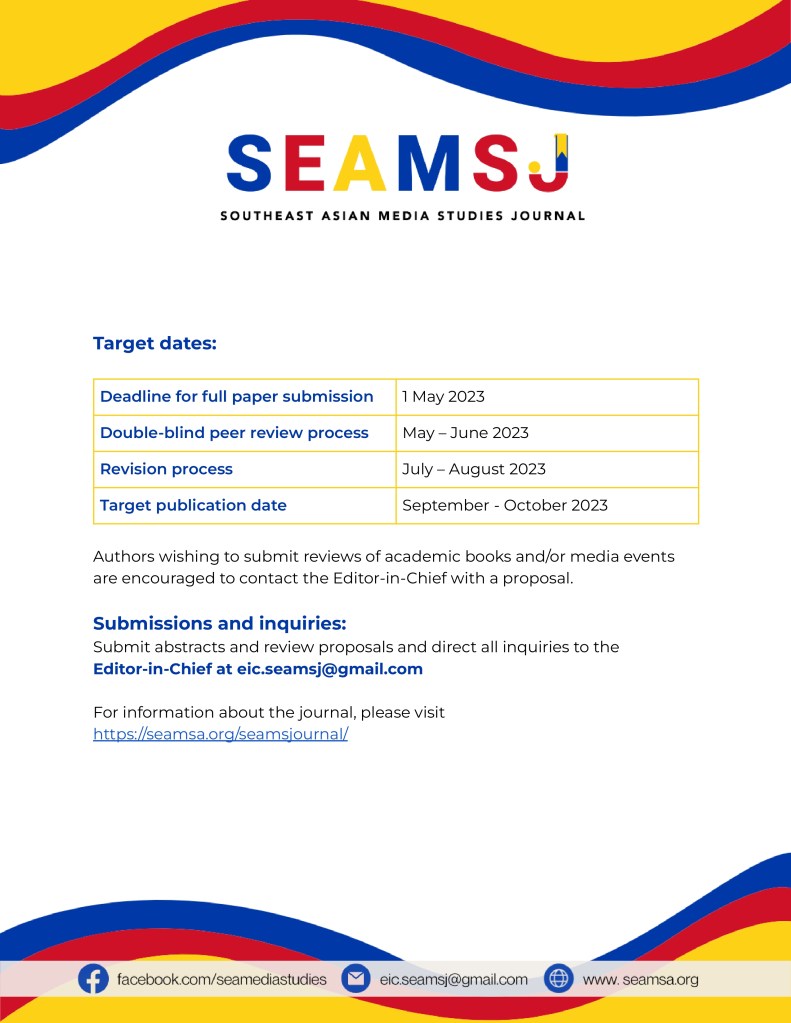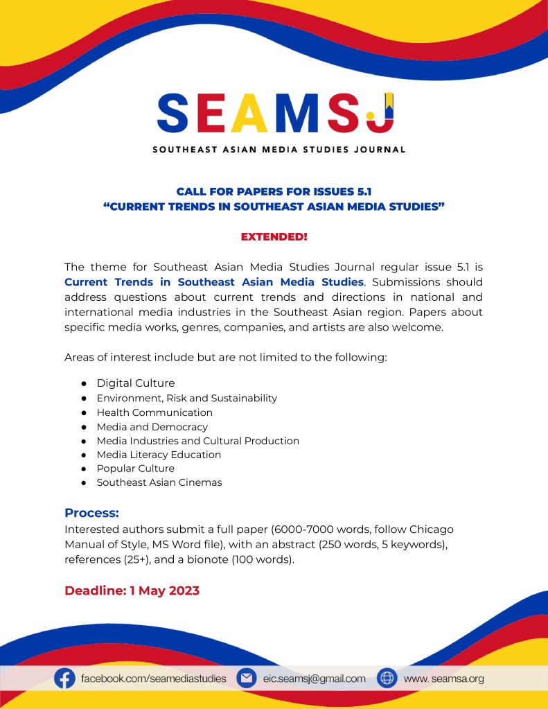 The theme for Southeast Asian Media Studies Journal regular issue 5.1 is Current Trends in Southeast Asian Media Studies. Submissions should address questions about current trends and directions in national and international media industries in the Southeast Asian region. Papers about specific media works, genres, companies, and artists are also welcome.