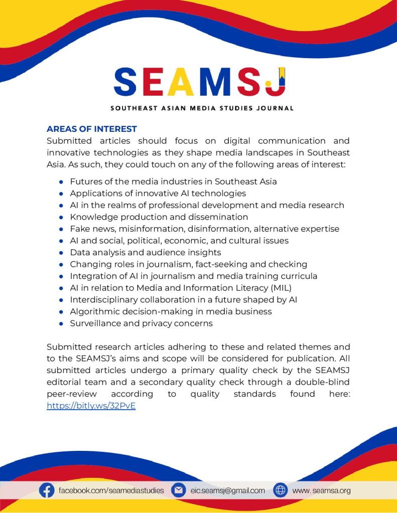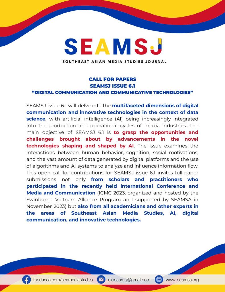 The theme for Southeast Asian Media Studies Journal regular issue 6.1 is Digital Communication and Communicative Technologies. This issue will delve into the multifaceted dimensions of digital communication and innovative technologies in the context of data science, with artificial intelligence (AI) being increasingly integrated into the production and operational cycles of media industries.