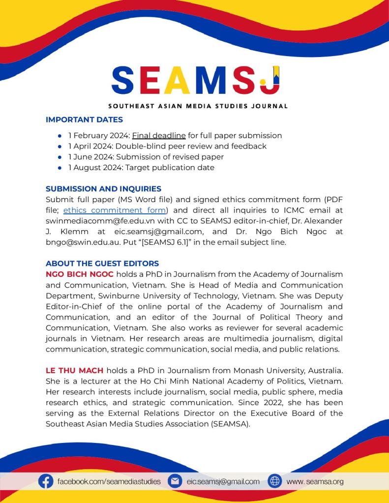 Submit full paper (MS Word file) and signed ethics commitment form (PDF File) and direct all inquiries to ICMC email at swinmediacomm@fe.edu.vn with CC to SEAMSJ editor-in-chief, Dr. Alexander J. Klemm at eic.seamsj@gmail.com and Dr. Ngo Bich Ngoc at bngo@swin.edu.au. Put “[SEAMSJ 6.1]” in the email subject line.