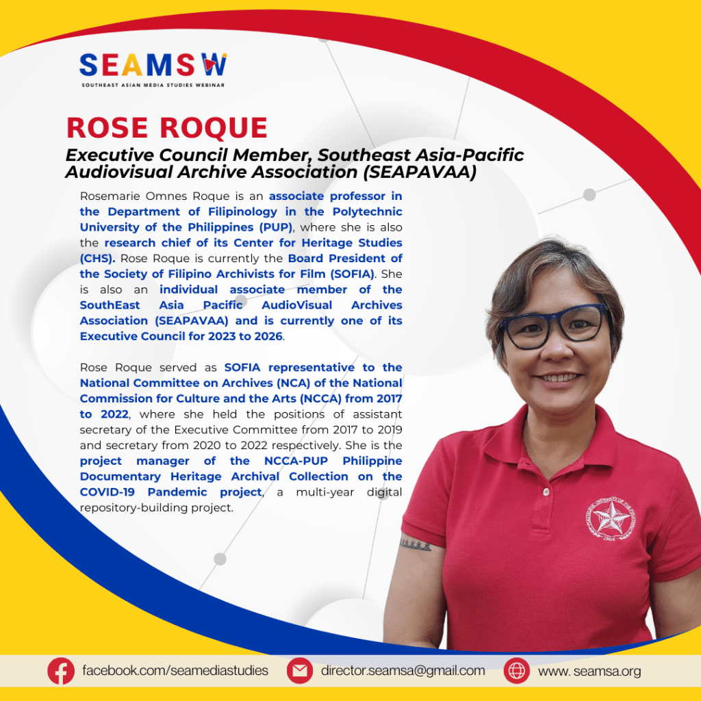 🎥 The Southeast Asian Cinemas Special Interest Group of SEAMSA is organizing a webinar titled “Securing Memory and Heritage: The Status of Audiovisual Archiving in Southeast Asia.” 🎬✨