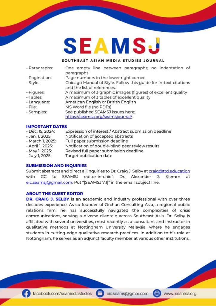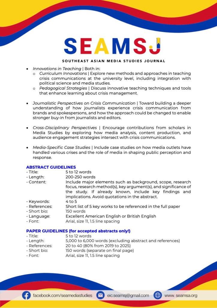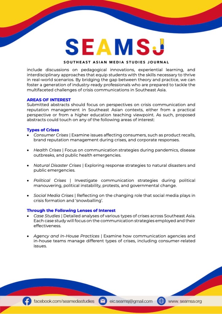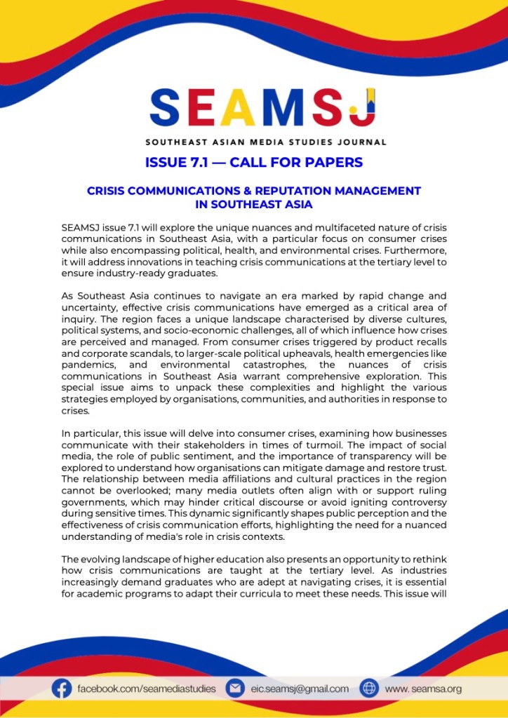 The theme for Southeast Asian Media Studies Journal issue 7.1 is Crisis Communications and Reputation Management in Southeast Asia. This issue will explore the unique nuances and multifaceted nature of crisis communications in Southeast Asia, with a particular focus on consumer crises while also encompassing political, health, and environmental crises. Furthermore, it will address innovations in teaching crisis communications at the tertiary level to ensure industry-ready graduates.