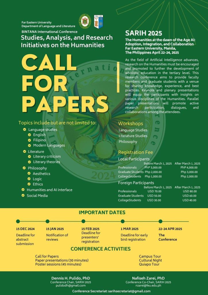 We’re thrilled to share that one of our institutional partners, Far Eastern University, through its Department of Language and Literature, will host the BINTANA International Conference “Studies, Analysis, and Research Initiatives on the Humanities” (SARIH 2025), scheduled for April 22-24, 2025. The conference will focus on the theme: “The Humanities at the Dawn of the Age of AI: Adoption, Integration, and Collaboration.” 🧠🤖