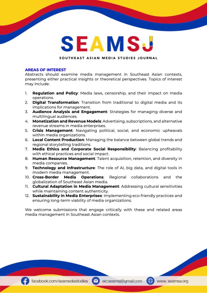 In the context of Southeast Asia, media management is further nuanced by unique cultural, economic, and regulatory landscapes. From navigating censorship and state control to managing multilingual audiences and addressing local content creation, media managers in this region confront challenges and opportunities. The management of media companies in Southeast Asia requires innovative strategies to adapt to these distinctive environments. This special issue seeks to examine the approaches, strategies, and practices of media management in Southeast Asia, offering a deeper understanding of the ways management shapes the media industries across the region.