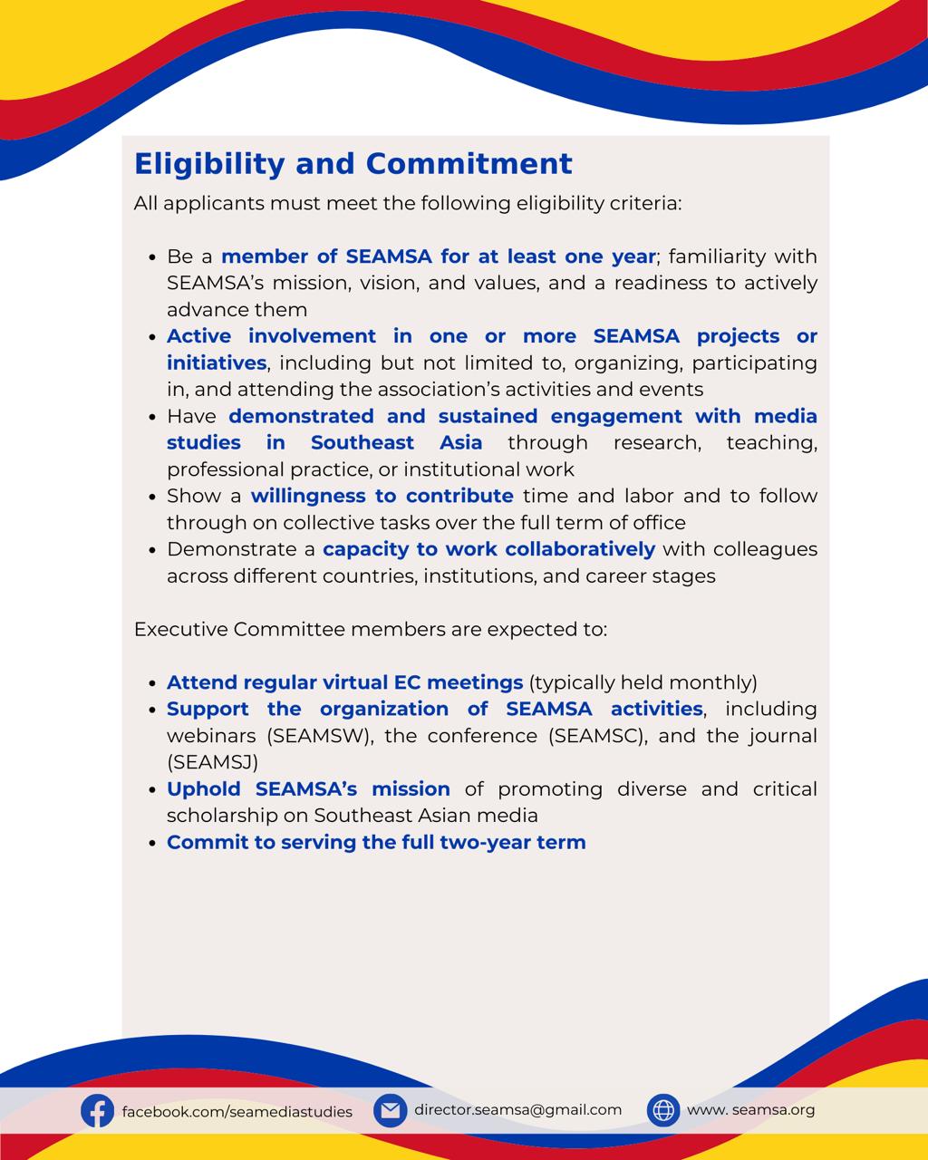 The Southeast Asian Media Studies Association (SEAMSA) is inviting applications to join our Executive Committee for the 2026–2027 term.